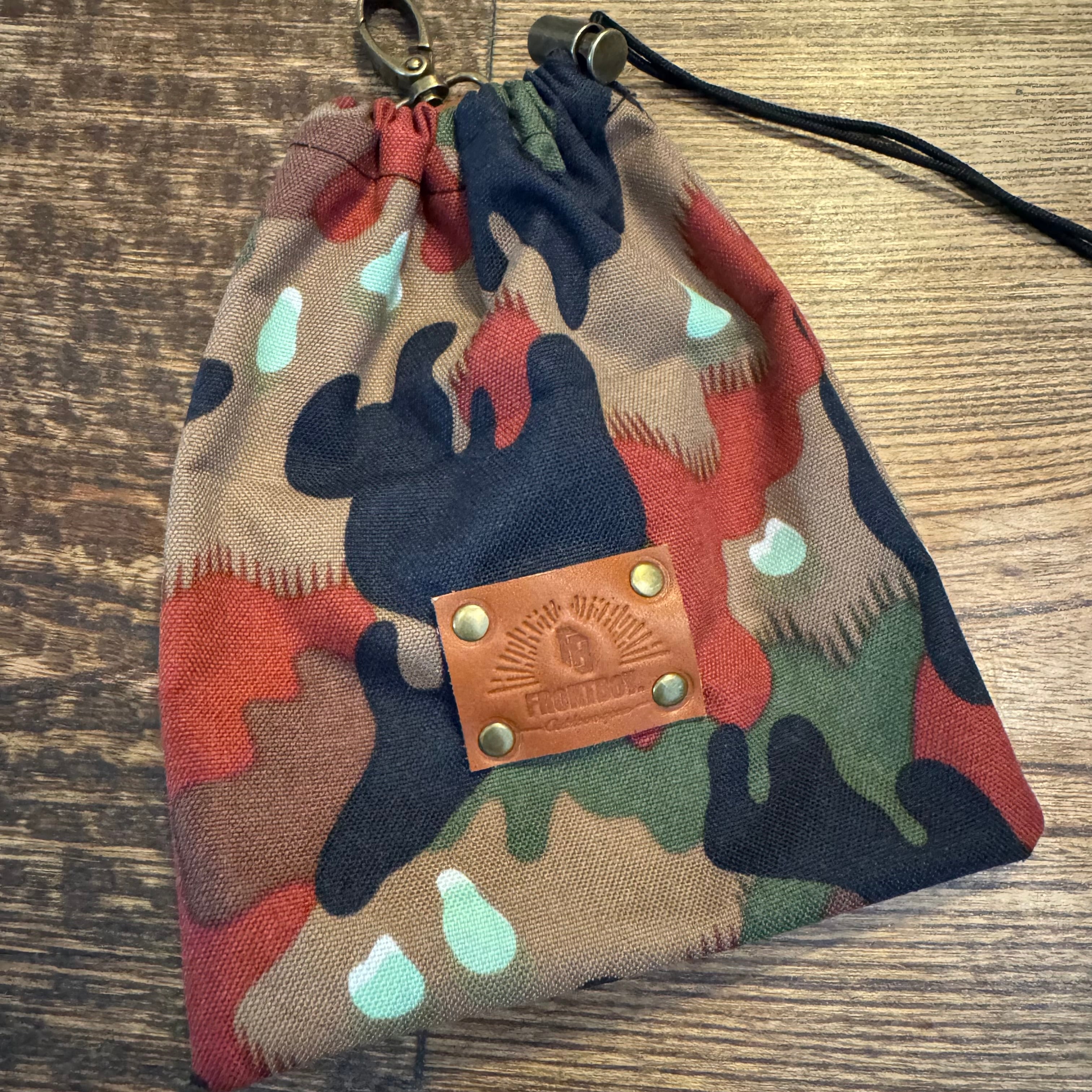 スイス軍のアルペンカモ柄生地を使用したFRoNTBoYオリジナルの巾着袋です