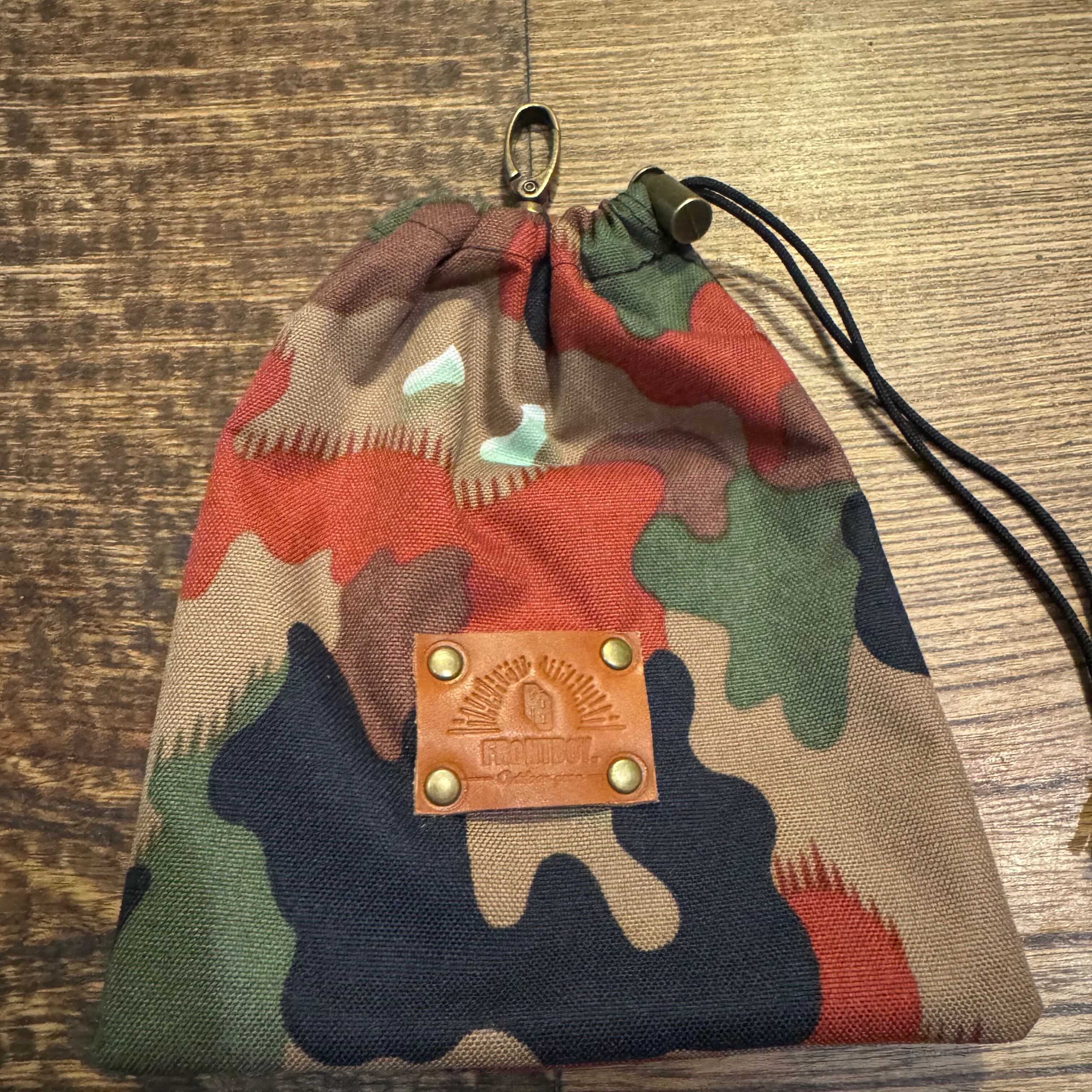スイス軍のアルペン迷彩生地を使用したFRoNTBoYオリジナルの巾着袋です